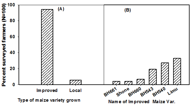 The parameters/variables recorded include: Gender and age of respondents, land tenure system, whether training on agronomic practices have been given, level of farmers’ trust for extension service, types and names of maize varieties grown, types and rates of fertilizers applied, plant density (at each crop stage), crop residue management (% residue retained), %weed cover, disease and pest incidence (%), maize cropping system, grain yield and cob numbers harvested, plot level GPS coordinate, altitude and field area measures. In addition, soil samples at the depth of 0-20 cm were collected from three quadrants and were bulked to form representative of that farm. The soil samples were analyzed following appropriate laboratory procedures for each nutrient using wet chemistry. Descriptive statistics was used to analyze and present the results.