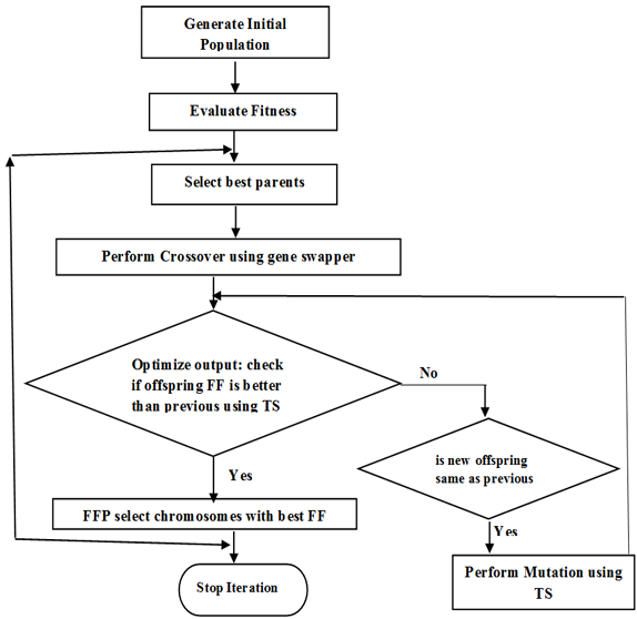 The CB helps to build prospective solutions by combining distinct genes already validated by the CF. The outcome of this component serves as input to the population generator. The Population generator helps to generate population of chromosomes by bonding several output of CB to produce a single generation. Next is the TS Optimizer, which makes use of Tabu search algorithm to produce optimized numbers of best crossover parent, offspring and mutation (parent or offspring) to yield best fit chromosomes. Furthermore, it helps the Gene Swapper to make the best move during gene swapping process within the chromosomes. The Gene Swapper helps to achieve the process of crossover and also produce the right choice of coded gene weight which will swap or replace existing gene with a chromosome validated by the CF. Lastly, the FFP is designed to select best fit chromosomes during population generation and production of final solution. The FFP depends on the TS-optimizer for accurate and best output. The proposed system architecture and flowchart are shown in Figures 1 and Figures 2 respectively.