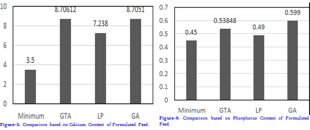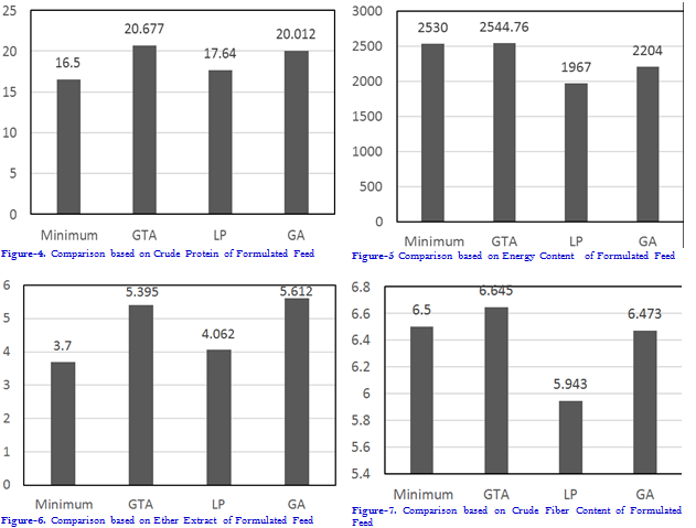 Results presented in Table 10 revealed that the nutrient content for layers mash formulated with TAM model is higher than the recommended minimum value and is higher than those formulated with LP and GA models except that the GA model’s ether extract content was slightly higher than that of TAM. The value for TAM is 5.395 while that of GA is 5.612. This difference however, may not have significant impact on the animals since the value for TAM is higher than the recommended minimum value. The results are further illustrated in Figures 4 to 10.