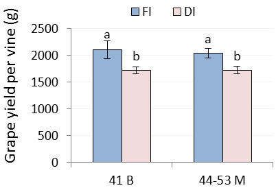 As expected, DI led significant decreases in grape yield per vine Figure 1. Grape yield and reductions in response to water limitation were quite similar between the grafting combinations. Grape yield of ‘Alphonse Lavallée’ underwent 22.2% and 18.2% decreases due to DI treatment. These decrease percentages might be acceptable for grape growing under mild drought stress conditions. The constraints posed by global climate change necessitate adaptive management, namely irrigation to stabilize yield, maintaining or improving grape and quality. The combined effect of drought, high air temperature and high evaporative demand during hot summer in many areas limit yield and berry quality in grapevines (Costa et al., 2007). The rootstocks used in this study slightly differed in modulation of the scion yield response to water deficit.