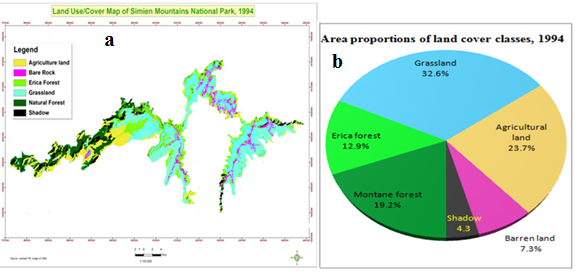 The sequence of percent coverage for the land classification of the 1994 was shadow, barren land, Erica forest, montane forest, agricultural land and grassland. Figure 2, shows that grassland accounted for the maximum share (32.6%) from the total area. Montane forest and Erica forest covered 19.2% and 12.9% respectively. Agriculture, barren land and shadow shared 23.7%, 7.3% and 4.3% coverage from SMNP respectively. Green vegetation (grassland, montane forest and Erica forest) covered larger area (64.7%) in SMNP than the remaining land use-land cover types (Agriculture, barren land and shadow) which, in total, accounted for 35.3%.