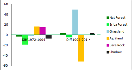 Land use classes showed variable extent of changes throughout the study period Figure 4. In the 1st reference period (1972 - 1994), agricultural (9945.56 ha) and barren land (3066.6 ha) showed a remarkable increase whereas montane forest (8040.69 ha), Erica forest (5446.3 ha), grassland (13693 ha) and shadow (1792.5 ha) showed shrinkage. In the second reference period (1994 - 2017), montane forest, grassland and shadow showed increasing trend with the dramatic increase in grassland at the cost of farm lands. Erica forest and farmlands land showed a decreasing tendency with a dramatic shrinkage in agricultural land.