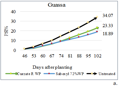 The disease progress rate (r): Was calculated by using linear logistic model (Van der Plank, 1963; Campbell and Madden, 1990) because this model was best fitted model with the majority of treatments obtained from both experimental sites than the Gompertz model as compared with coefficient of rate determination (R2)and the calculated value were analyzed: