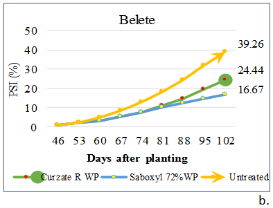 Similarly, at Adet, the disease symptom was appeared very early (38.67 DAP) on the susceptible variety Abalo. Whereas, the disease appeared lately (65.67 and 61 DAP) on untreated moderately resistant varieties Belete and Gudene, respectively. However, the disease has seen very late (93.67 and 93.33 DAP) on the Saboxyl 72% WP fungicide treated plots of Belete and Gudene varieties, respectively Table 2. Binyam et al. (2014b) reported that the disease appeared lately on moderately resistant varieties than moderately susceptible and susceptible varieties. Similarly, Solano et al. (2014) reported that potato genotypes which developed late blight symptom early are susceptible and genotypes that developed late blight lately in the crop cycle are resistant.