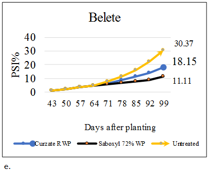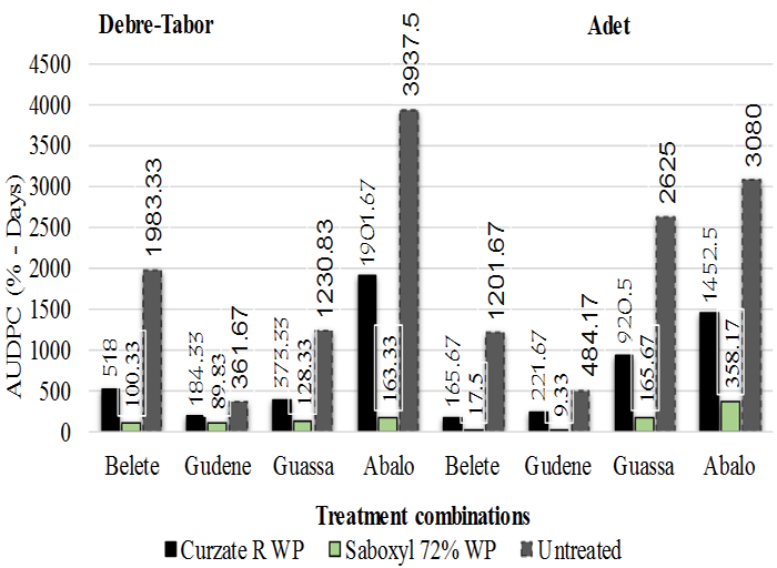 The disease progress rate (slope) was varied among the varieties. The highest disease progress rates (r = 0.214182 and 0.132202-unit day-1) were obtained at unsprayed plots of Abalo and Belete, respectively at Debre-Tabor and the lowest progress rate (r = 0.006900) was obtained from Saboxyl 72% WP fungicide treated plots of Abalo followed by Gudene (r = 0.022426). Whereas, at Adet the highest rate (r = 0.186593unit day-1) was obtained from unsprayed Guassa followed by Abalo (r = 0.170152-unit day-1). On the other hand, the lowest progress rates (r = 0.009467- and 0.015721-unit day-1) were obtained on Saboxyl 72% WP sprayed Gudene and Belete, respectively Table 3.