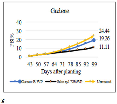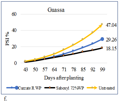 Analysis of percent severity index (PSI %) revealed highly significant (p<0.01) difference among the interaction of varieties and fungicides starting from 50 and 53 DAP at Adet and Debre-Tabor, respectively Figure 1 and Figure 2. While at the initial date of assessment (43 and 46 DAP) only the main effect of varieties showed significant difference but the fungicide and the interaction effects were non-significant (P>0.05) at both sites of the experiment, because the fungicides at this stage were not applied. The highest PSI obtained at 43 and 46 DAP of Adet and Debre-Tabor was 2.22% on Abalo and 1.85% on Guassa at Adet, whereas, the other varieties have only 1.11%. The maximum PSI (%) was recorded from untreated Abalo at each date of assessment from both sites followed by unsprayed Guassa at Adet and Abalo combined with Curzate R WP fungicide at Debre-Tabor Figure 1 and Figure 2. Even though, the disease was appeared lately on Belete the progress was nearly similar with variety Guassa and even faster after 88 DAP at Debre-Tabor Figure 1. The final PSI of the plots with different fungicide applications ranged from the least (16.67 and 11.11%) for the variety Belete and Gudene sprayed by Saboxyl 72% WP to the highest (62.59 and 53.7%) PSI % for the unsprayed Abalo from Debre-Tabor and Adet, respectively Figure 1 and Figure 2. However, the magnitude of disease severity was significantly different among varieties that was higher on Abalo than Guassa and moderately resistant varieties (Belete and Gudene) at both sites. This result coincides with the findings of Olanya et al. (2001) that late blight severity in fungicide treated plots was very low, however, it was highest in the untreated plots of susceptible variety, and also Bekele and Hailu (2001) reported that the highest disease severity has found on the unsprayed susceptible variety (Alemaya-624) as compared to on the tolerant variety (Tolcha).