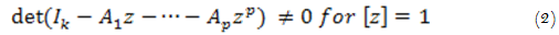 where: Ik denotes the number of orders; Ai represents (K x K) coefficient matrices for i = 1,…, p; and z represents the number of roots.