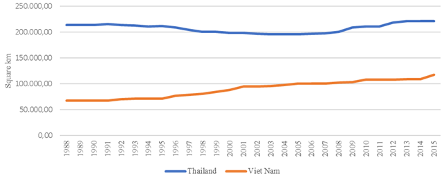 Figure 2 shows that agricultural land of Thailand was about doubled higher than that of Viet Nam for 28 years (1988–2015). In 1988, agricultural land of Thailand was higher than that of Viet Nam more than tripled and by 2015, the gap accounted for about 1.8 times. These imply advantages of Thailand in agricultural and food production.