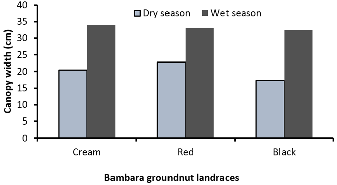 Canopy width of the three Bambara groundnut landraces is presented in Figure 3. Red had the widest (22.8 cm) width of the canopy in the dry season trial, and when averaged across the two seasons. Black had the lowest canopy width of 17.3 cm and 32.4 cm in the dry and wet season trials, respectively. The canopy width was wider in the wet season when averaged across the landraces than the dry season planted crops.