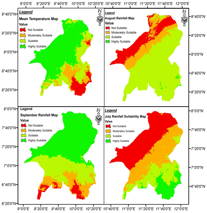 In an attempt to produce the map of the various selected criteria as layers for agro-climatic zoning of Taraba State for rice production, each selected criterion was analyzed and produced separately using Arc GIS 10.2. For the selected Agro-climatic variables, the critical climatic variables influencing different rice varieties selected from stepwise multiple Regression analysis result were the identified climatic criteria for the zoning. This is based on the fact that they were identified to be the critical climatic factors influencing the growth and yield of rice in the State, as such, they are recommended to be the only climatic criteria that were used in the Zoning as also suggested by Adebayo (2000) and Ayoade (2005). Criteria map of each selected variable was generated from interpolation maps produced and the world mean spatial climatic maps. The Spatial climatic maps were downloaded in raster format and were then added into the Arc GIS environment. Taraba State area was then extracted from the maps using extraction by mask in the Arc toolbox and was scaled and reclassified into four (4) classes as highly Suitable, Suitable, Moderately Suitable and not suitable area using reclassify tool in Arc toolbox. The suitability scale used was generated based on the nature and extent of the relationship between the climatic variables and rice yield obtained in the stepwise multiple regression, related literature on rice climatic requirement for growth and yield as well as an idea from experts.