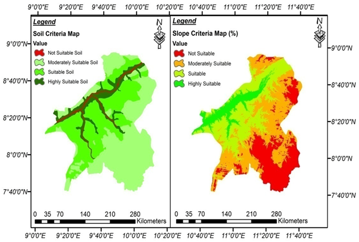 Soil texture map of Nigeria downloaded from European Digital Archive of Soil Maps (EuDASM) (2017) on the other hand was added to the Arc GIS environment, Georeference and Digitized. All the digitized layers with the same soil texture characteristics based on the soil requirement for rice production were selected and merged together as one class using merge tool in editor menu of the Arc GIS and was then reclassified into four classes (highly Suitable, Suitable, Moderately Suitable and not suitable). The method used by Getachew and Solomon (2015) and Joseph, Bosco, and Murage (2013) was adopted in scaling the soil texture and slope suitability zone for rice cultivation.