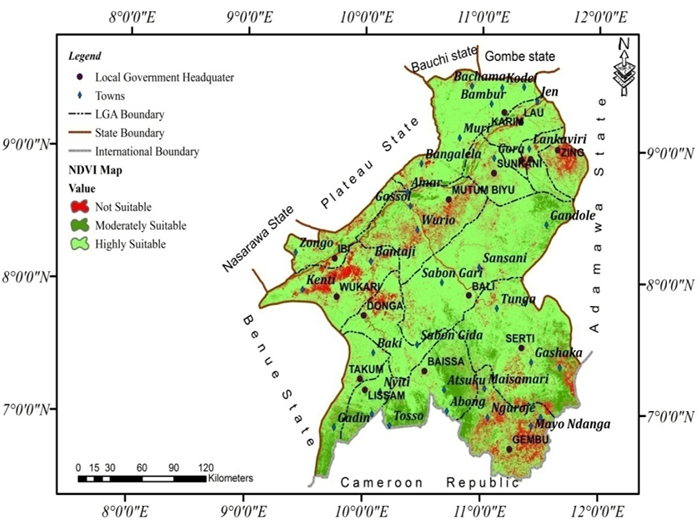 Alluvial soil type are type are found on the flooded plains of rivers they run along Benue River and other rivers, and do not depend highly on climate and vegetation for their formation but their underlying parent rock is the most important factor in their formation (Iloeje, 2001). Sudan Vegetation, Northern Guinea Savanna, Southern Guinea Savanna, Forest derive savanna and mountain forest and grassland are the major vegetation types in the area (Ekaete, 2017). Sudan vegetation covered places around Karim Lamido, Lau, Jalingo, Ardo Kola, Yorro and Zing LGA, while Northern and southern savanna covers the major part of the State and include LGAs such as Gassol, Ibi, Wukari, Donga, Bali, Takum, Ussa, Kurmi and Gashaka LGA.