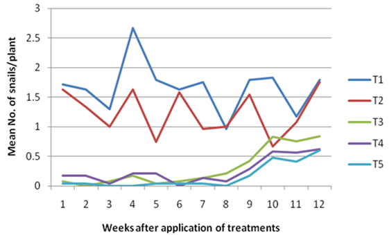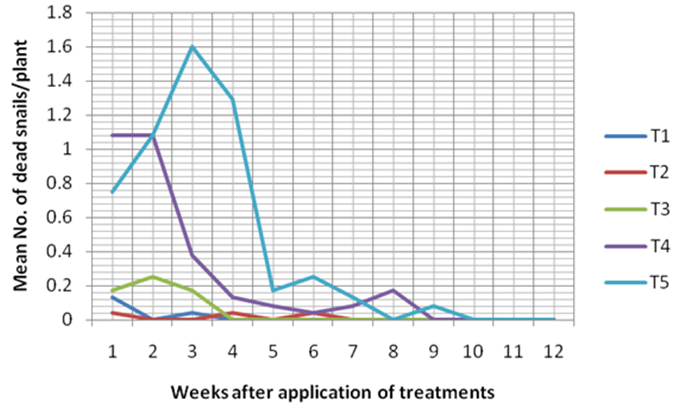 The number of dead snails was relatively higher in the Limace® and Vydate® treatments (with means of 1.6 snails/plant and 1.08 snails/plant respectively) during the first three weeks Figure 4. From the 5th week after application of the treatments, the mean numbers dropped in all treatments and was less than 0.4 snail/plant Figure 4.