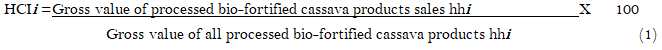 The household commercialization index (HCI) in Equation 1 was used to determine household specific level of market participation. The index measures the ratio of the gross value of processed cassava products sales by household i in year j to the gross value of all the processed cassava products by the same household i in the same year j expressed as a percentage. The index measures the extent to which household bio-fortified cassava processor is oriented toward the market. A value of zero would signify a totally subsistence-oriented household and the closer the index is to 100, the higher the degree of commercialization. The advantage of this approach is that commercialization is treated as a continuum thereby avoiding crude distinction between “commercialized” and “non-commercialized” households.