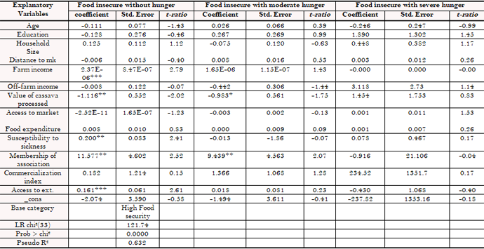 The estimation of the multinomial logit model for this study was undertaken by normalizing one category, which is normally referred to as the ‘‘base category.’’ In this analysis, the first category (High Food Security) was the base category. The estimated coefficients of the MNL model, along with the levels of significance, were presented in Table 5. The MNL was run with and without explanatory variables such as access to extension, membership in association and distance to output market assuming this variable to be endogenous as they are in many studies. The results indicated that the inclusion of theses variables does not significantly change the parameters of the estimate (the Hausman test has been employed to compare the models with and without these variables). Also, the ordinary least square model was fitted and the model was tested for multicollinearity using the variance inflation factor (VIF). The variance inflation factors are less than 9 (1.03-2.07) which indicate that multicollinearity is not a serious problem in this model. Lastly, the model was run and tested for the validity of the independence of the irrelevant alternatives (IIA) assumptions by using both the Hausman test for IIA and seemingly unrelated postestimation procedure (SUEST). Both tests failed to reject the null hypothesis of independence of market participation on food security status, suggesting that the MNL specification is appropriate to model of the food security status of the processors (X2 ranged from 3.42 -38.36, with probability values ranging from 0.67 to 1.00 in the case of Hausman test and X2 ranging from 9.06 to 26.18, with a p value of 0.31- 0.82 in the case of SUEST). The result in Table 5 showed that farm income, value of processed bio-fortified cassava output, susceptibility to sickness, membership of association and access to extension services significantly affected the food insecurity status of the biofortified cassava processors in South Western, Nigeria.Table-5. Estimates of the multinomial logit for food security status among bio-fortified cassava processing households.