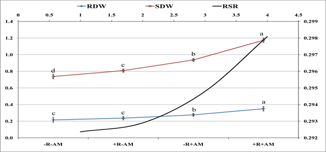 Shoot and root dry weight (SDW and RDW) of plants under different treatments were analyzed at 50 DAS Figure 1. Rhizobial and/or AM inoculation improved root growth, thereby increasing root’s absorptive surface area and the degree of explored soil for resources, which could also be associated with the improved above ground plant parts. Though benefits endorsed by co-inoculation of R and AM inoculation were the most significant, AM inoculation could provide higher degree of assistance in plant growth than rhizobial inoculation. Microbial colonization being more effective in improving RDW than SDW, led to higher RSR relative to non colonized plants.