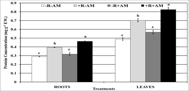 The total proteins were estimated in fresh roots, nodules and shoots by method ofBradford (1976)where spectrophotometeric O.D. was taken at 595 nm and protein concentration was calculated in mg g-1 F.W.