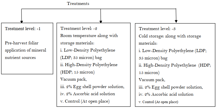 Visual and sensory quality, physiological weight loss (PLW), and marketability were observed on a daily basis at room temperature conditions and on a 5-days basis at cold storage condition and cumulative results were recorded. The change of curd color was observed by eye estimation and to ascertain the shelf life of curd both at room temperature and cold storage condition. The recorded data of various characters were analyzed with the help the of Statistical Tool for Agricultural Research (STAR) Program and the mean values of all the treatments had been adjudged by Tukeye's test at 5% level of probability for interpretation. Benefit-Cost Ratio (BCR) for each treatment was calculated based on the present market prices of inputs and outputs in order to find out the maximum profitable treatment.