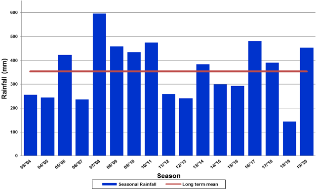 The results of the rainfall data for the 2003/04 to 2019/20 are shown in Figures 3 and 4. The mean average rainfall for the commercial and communal areas was 357±120mm and 456±150mm respectively. These averages correspond well with long term rainfall figures obtained from the farmers of these two areas - a figure of 350mm was given by the framers for the commercial areas and 440mm for the communal areas. From these figures it is further clear that eight (8) seasons can be described as receiving below average rainfall and nine (9) seasons receiving above average rainfall. Although seasons 2006/07 and 2014/15 in the communal areas Figure 4 appeared to be average rainfall years, the distribution of the rainfall throughout the seasons was very erratic - in both seasons the active growing period (January - March) received below average rainfall and was thus identified as 'dry' years. The same tendency occurred during the 2017/18 season in both areas Figures 3 and 4 as well as the 2018/19 season in the communal areas Figure 4. From these figures it appears that above average rainfall occurred, but again below average rainfall was received during the growing season in both areas.