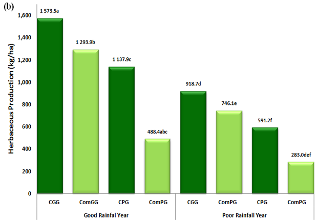 In the grazed sites it is clear that the poor communal sites differed significantly from the good and poor commercial sites as well as the good communal sites during good rainfall years Figure 5(b). In all the other mentioned sites the herbaceous production was above 1000kg/ha whilst is was below 500kg/ha for the poor communal sites. As in the case of the benchmark sites rainfall, or the lack of it, had a huge influence on the herbaceous production. The herbaceous production in all the sites in both land-uses decreased during the low or poor rainfall years. Once again the poor communal sites differed significantly from the good and poor commercial sites as well as the good communal sites during the poor rainfall years.