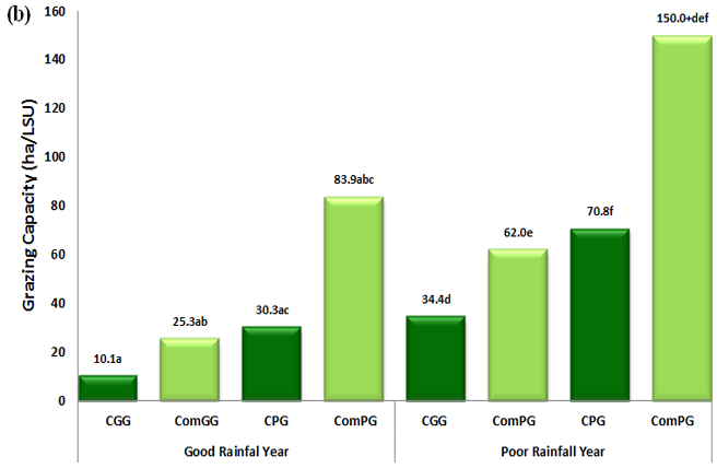 During the poor rainfall year the grazing capacity figure of the poor communal rangeland is indicated in Figure 6(b) as 150+ha/LSU – the actual grazing capacity figure for these rangelands is 519ha/LSU but for visibility purpose of the figure it was indicated as 150+ha/LSU. The grazing capacity figure of the poor communal rangeland differed significantly from the figures of the good and poor commercial and good communal rangelands.