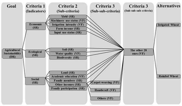 Sustainable indicators are principally workable approaches and credible tools for assessing farm performances in economic, ecological, and social terms (Rigby, Woodhouse, Young, & Burton, 2001). The indicator is “a variable that describes the state of a system” and can be used to “evaluate the health of the system” (Pham & Smith, 2013; Walz, 2000). Several studies have introduced different indicators for sustainable agriculture assessment (e.g. (Bonny, Prasad, & Paulose, 2010; Dantsis, Douma, Giourga, Loumou, & Polychronaki, 2010; Hayati, Ranjbar, & Karami, 2010; Heink & Kowarik, 2010)). However, the division for sustainable development and the statistics division of the United Nations in 2007 released general indicators for sustainable development assessment (United Nations Publications, 2007). Accordingly, to facilitate the process of choosing different criteria, three general groups of indicators were categorized (United Nations Publications, 2007): economic, ecological, and social. The economic indicators normally encompass crop productivity, per capita food grain production, net farm income, and the benefit-cost ratio of crop production. The ecological indicators should explain the environmental quality of farms or environmental impacts of the production process in farms (Dantsis et al., 2010; Hayati et al., 2010; OECD Organization for Economic Co-operation and Development, 2011). The social indicators include food self-sufficiency, access to resources and training services, educational background of farmers, and equitability in food and income distribution among farmers. Due to such multi-dimensional concept of sustainability (Bonny et al., 2010; Tiwari, Loof, & Paudyal, 1999) as well as the lack of reliable quantitative data and complexity of agricultural decisions (Reed, Chan-Halbrendt, Tamang, & Chaudhary, 2014) especially in developing countries, hence, a large number of studies have recently focused on the applicability of multi-criteria decision analysis (MCDA) as an approach to analyzing agricultural sustainability (Ananda & Herath, 2009; Dantsis et al., 2010; Herath, Hardaker, & Anderson, 1982). Hence, this study also applied MCDA to measure agricultural sustainability index for wheat production in both irrigated and rainfed farms located in the semi-arid environments of Mashhad, northeastern Iran.
