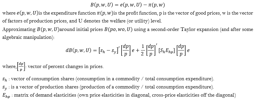 The last expression formally corresponds to the concept of Compensating Variation (CV), or the extra income needed to achieve the original level of welfare after the change in prices. It can be interpreted as the combination of a direct effect and a substitution effect: