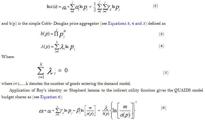 Where[lnm-ln a(p)] = indirect utility function of the PIGLOG demand system (that is, a system with budget shares linear in the log total expenditure) and m = total expenditure,