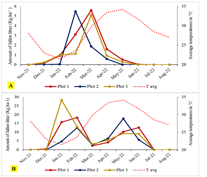 Figure 3 illustrates the monthly variations in litter quantities recorded. It appears that the production of litter takes place over a period of time with a shift in production peaks (February and March) in Boussaragui as shown in Figure 3A. However, at Dan Saga, production is done in two stages (November-March ; March-June) with a gap between peaks Figure 3B as in Boussaragui.