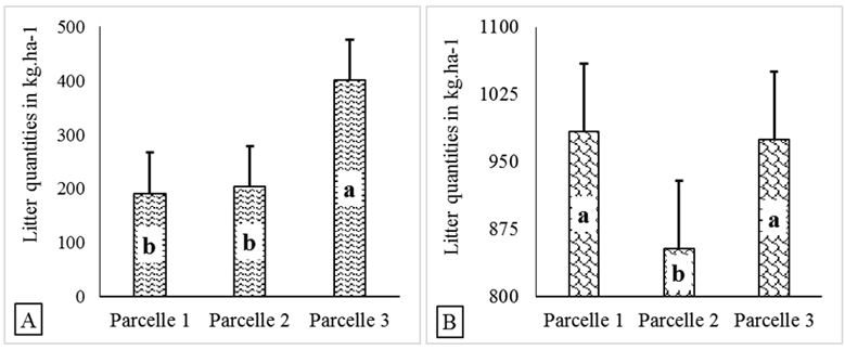 Figure 5 presents the quantities of litter recorded in the three plots by terroir. It can be seen that the quantities of FOM returned to the soil under ANR vary between the terroirs and plots. The quantities harvested in Dan Saga are four times higher than those recorded in Boussaragui. In fact, they are on average 937.62 kg.ha-1 in Dan Saga and 265.52 kg.ha-1 in Boussaragui. As for the quantities harvested per plot, they vary from 191.61 kg.ha-1 to 400.85 kg.ha-1 in Boussaragui. On the other hand, they varied between 853.75 and 983.91 kg.ha-1 in Dan Saga.