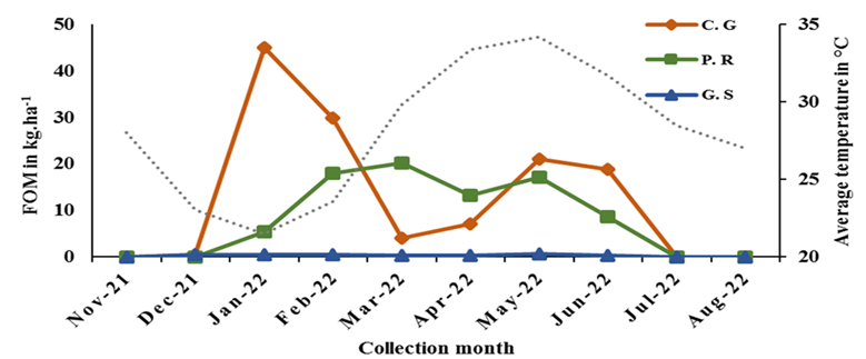 Figure 7 records the monthly variations in FOM arriving on the ground according to the main species found in the study plots. This figure is based on the total amount of FOM in the plots by species.