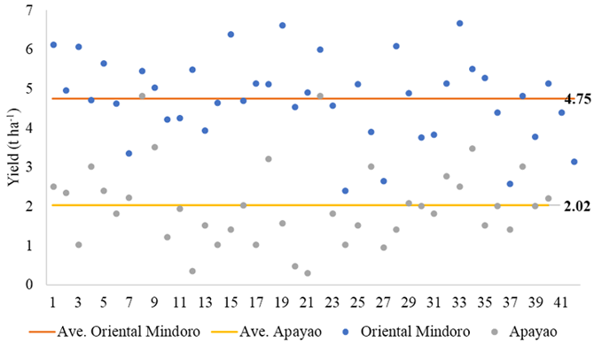 Figure-1. Scatter diagram of yields of aromatic rice in Oriental Mindoro and Apayao, 2017.