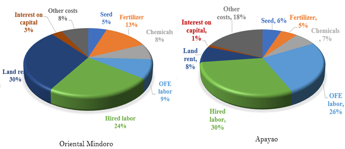 In Apayao, farmers spent an average of P13 on a per-kilogram equivalent or a total expenditure of P25,211 ha-1 (Table 4). From the total costs, hired and OFE labors incurred the biggest shares of 30% and 26%, respectively (Figure 2), resulting from the low level of adoption of machines. Despite scanty applications of chemicals in the farm, farmers allocated a substantial cost of 7% on pesticides and 5% on fertilizers. Deducting these expenses from the gross returns, a farmer can attain a net income of P10,934 ha-1. Those who own land and capital, and render no OFE labor services may earn P19,566 ha-1.