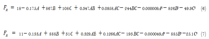 is exhibited by B, followed by A and least for C. This is because B has the lowest P-value than A and C. The squared main factor is also highest for B2, followed by A2 and least for C2. Their interactions are less significant as BC shows the least contribution. Using the backward elimination of terms, setting P-value at 0.05, terms that are less significant to equation (6) and (7) such as A, C, AB, AC, BC, A2 and C2 are removed to enhance the models. The reduced quadratic models are shown in equation (8) and (9) respectively