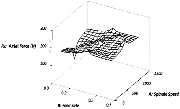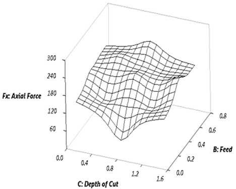 It is observed from Table 5that the greatest effect on the feed cutting force is exhibited by B, followed by A and least for C. This is because B has the lowest P-value than A and C. The squared main factor is highest for B2, followed by C2 and least for A2. Their interactions are less significant as AC shows the least contribution. Also, it is observed from Table 6 that the greatest effect on the feed cutting force