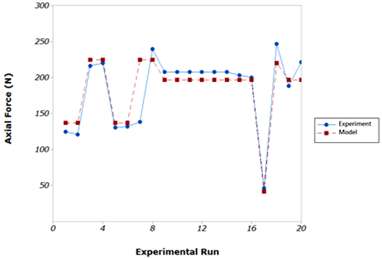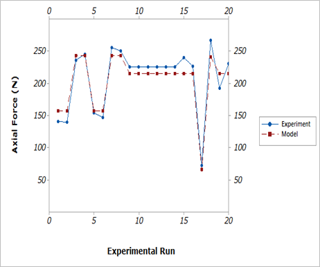 The models in equation (8) and (9) generated for both tool-workpiece combinations respectively were validated by comparing their predicted force values in Newton with their measured values.