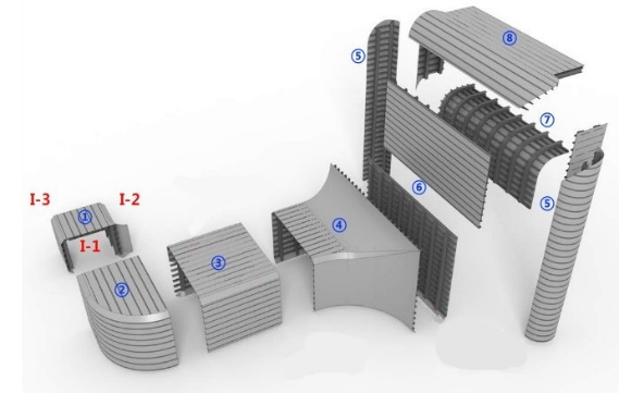 To solve this technical problem, the project team solved the construction formwork problem of the irregular body by the method of “BIM plus detachable steel formwork”. Before the template processing, the requirements of split, installation and handling were taken into consideration through the BIM digital platform to repeatedly split the template selection. The complex special-shaped multi-curved surface was then divided into eight blocks (Figure 9). According to the specific size, the steel plate and template support are applied to weld and assemble the template.