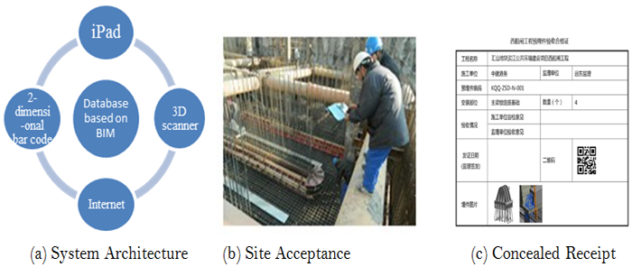 The system mainly consists of mobile end and database. The method firstly generates 3D images of embedded parts and corresponding standard table codes in a database through BIM. When the embedded components are installed, the 3D scanner can be used to detect the integrated elements and the adjacent door groove structure, and to use the Internet to connect with the database, and the background server can find the corresponding embedded parts graphics, so as to realize the installation orientation and the guiding installation of the integrated components. In the acceptance stage, because each mixed piece has a unique two-dimensional scanning code after completion, and only corresponds to the standard table code of the database, the two-dimension code scanning of the embedded section is carried out through the iPad mobile terminal. By using the wireless network to correspond the field photos with the database images, the system can automatically generate the quality check sheet of the embedded parts and evaluate and feedback the construction quality of the integrated components in time. Through this method, the construction precision and installation accuracy are significantly improved, and there is no difference leakage of the embedded parts in the West Ship lock Project, and the whole lifecycle management of the installation of the hydraulic pre-buried parts is realised, and the excellent application effect is obtained.