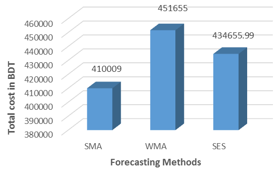 In demand scenario Few the maximum SL found here is 91.57% and minimum IL is 15.60% which is the best result in the entire APP scenario for SMA. WMA also shows a near result in terms of SL but IL is high compared to SMA and IL. The best SL in the entire APP scenario is obtained applying SMA for High. Here also SMA shows the best result in terms of SL and IL than the other two techniques. The Peak is the most challenging one in terms of planning. The best result is found for SMA with a 93.95% service level. WMA shows the worst SL for Peak but minimized IL. The worst result of applying WMA is because it is very important to estimate accordingly as an overestimated Peak season will automatically lead to a huge allocation of resources. Therefore there will be no free capacity resources to react to unexpected customer orders.