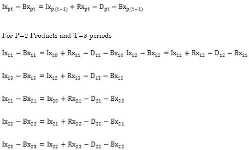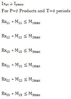Where, in the first constraint (1) Dpt denotes forecasted customer demand of the pth product in period t and represents the sum of regular time production, inventory levels, backorder levels essentially should equal market demand. The second equation ensures that the production amount does not exceed machine capacity and the third constraint determine the level of inventory. Model is expanded and solved for 2 products (P=2) and three periods (T=3). The expansion is given in the Appendix.