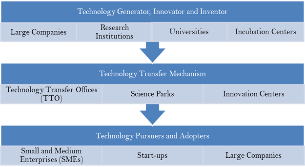 As Figure 9 shows, a modified technology transfer (MTT) model where large companies, research institutions, universities, incubation centers are worked as technology generators, innovators, and inventors. The developed technology will be translated into a usable form by a technology transfer mechanism. The Technology Transfer Offices (TTO), science parks, innovation centers are the main catalyst of this TT mechanism. Technology pursuers and adopters are small and medium enterprises (SMEs), start-ups, and large companies seeking the technology for their use.