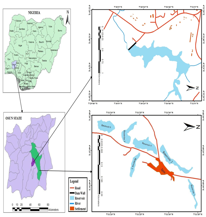 The study areas are abandoned gold mine reservoir at Igun village in Atakumosa West Local Government area of Osun State and Opa freshwater reservoir at Ife central local Government area of Osun State. The abandoned gold mine reservoir extends over longitude 004030E-004045E and latitude 07035N-07038N. Streams such as Oika, Eleripon and Osun which serve the community were impounded to form reservoirs in order to meet the mining needs of the Nigerian Mining cooperation which started in December 1941. While Opa reservoir is located in Ile-Ife, Osun State, Nigeria and was impounded in 1978. The major tributaries are rivers Opa, Obudu and Esinmirin. The reservoir has a catchment area of about 116km. The reservoir extends over latitudes 07021'N and 07035'N and longitudes 004031'E and 004039'E Figure 1 .
