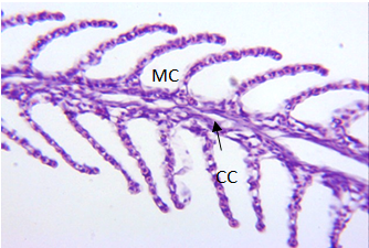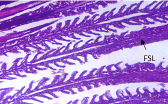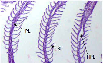 Plate-1.1a. Photomicrograph of gill section in Hemichromis fasciatus of Opa reservoir (Mag. X40).