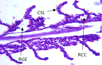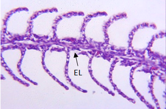 The gills of a fish play a vital role in maintaining of aquatic organism ionic homeostasis [23 ]. Subsequently many contaminants come in close contact with gill epithelium and causes injury. The damages could depends on the level and period of exposure of the pollutants. Hypertrophy of primary lamellae and epithelial lifting observed in the gills of H. fasciatus in Opa reservoir were similar to the results of Yogita and Mishra [24 ]. The authors noted that epithelial lifting could lead to dysfunctional or even non-functional gills, and sudden death of the fish. Similarly, histopathological alterations observed in the gills of H. fasciatus in Igun reservoir were similar to the findings of Abdullah [25 ] who observed epithelial necrosis and rupture of the gill epithelium induced by zinc ions in Cyprinus carpio. The epithelium lifting is considered to be one of the initial reactions of the gill to variety of pollutants according to Al-Mansoori [26 ]. The histopathological alterations in this organ are a response to exposure to non-specific pollutants [27 ].