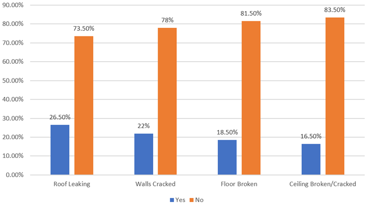As is revealed in Table 2, 33% of the houses had over two individuals living in each room. Precisely, the data for building conditions found that 26.5% of families live in houses with a leaking roof, 22% in houses with fractured walls, and 18.5% in houses with broken floors.