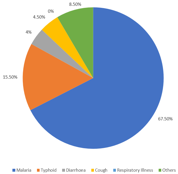 Regarding the perceived health conditions of the people, the vast majority of the homes reported an illness, with 67.5% reporting malaria. The distribution of disease occurrences indicated that typhoid was prevalent in 15.5% of households; 4.5% of households reported cough occurrences; 4% of households had members who suffered from diarrhoea; and 8.5% of households reported other illnesses such as skin disorders Table 4.