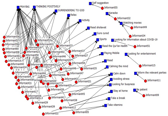 Based on the sociogram map in Figure 2, from sixty-one informants, most of the COVID-19 swab test participants in Indonesia managed their anxiety by praying many strategies, thinking positively, trusting in God’s plan (tawakkul) and surrendering to God, and doing relaxing activities. Most chose more than one way of managing anxiety described in the sociogram in the form of more grouping networks. Some informants only opted for one strategy to manage anxiety: watching movies, doing karaoke, looking for entertainment, suggesting themselves, finding information about COVID-19, and being patient. One options strategy for managing anxiety was described in a sociogram map in the form of a disseminating network. This construction of meaning on experience (Sulaeman et al., 2021) managing anxiety and uncertainty was a natural truth from a phenomenological perspective (Given, 2008; Sulaeman et al., 2021).