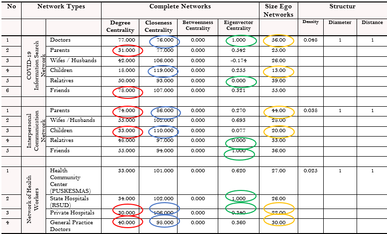 In general, tracking social communication networks can be done based on internet-based networks, such as via email and other social media. Social communication networks via the internet eliminate the reality of physical, social bonds (De Choudhury, Mason, Hofman, & Watts, 2010). Internet-based communication networks also influence public opinion and serve as the basis for interpersonal conversations (Zhang, Feng, & Yang, 2019). However, in the context of managing anxiety and uncertainty of information on swab test participants in Indonesia, it is carried out with physical, social ties through interpersonal communication networks with the closest ones who are considered to have honesty, openness, and understanding about COVID-19. The interpersonal communication network map was analyzed with the UCINET-NetDraw software and is described in Table 1.