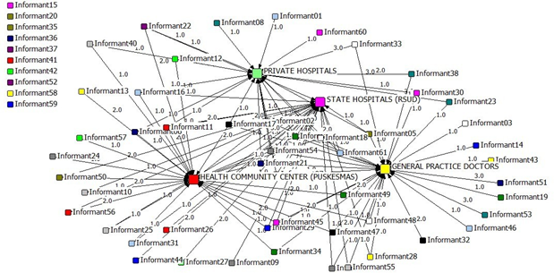 The description of the communication network between informants and health community centers, state hospitals, private hospitals, and general practice doctors can be seen in the sociogram map (Figure 5).