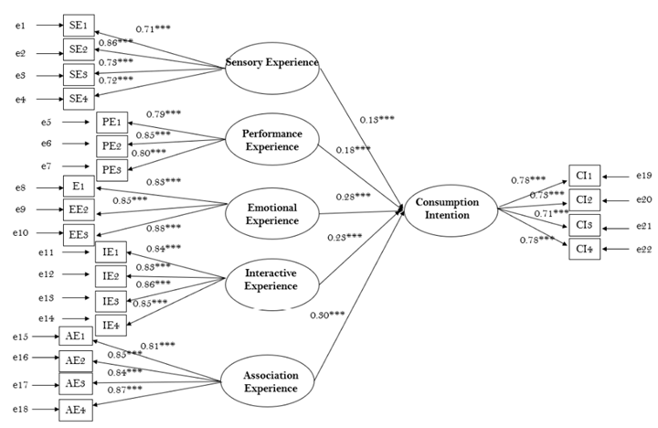 Table 2 shows all variables of CR and AVE were in the range of 0.839 to 0.91and 0.556 to 0.728, respectively. The factor loading of each item is greater than the cut-off value of 0.7. Similarly, we found that the variables examined exceeded the Heterotrait-Monotrait Ratio of Correlations (HTMT) requirement of value less than 0.9. In addition, the Cronbach's α coefficient for variables of sensory experience, performance experience, emotional experience, interactive experience, association experience, and consumption intention is respectively 0.838, 0.852, 0.886, 0.910,0.905, and 0.839. According to Hair, Ringle, and Sarstedt (2011) the measurement model meets the academic standards in terms of reliability, convergent validity, and discriminant validity.